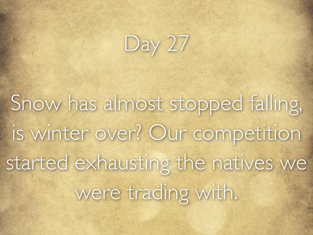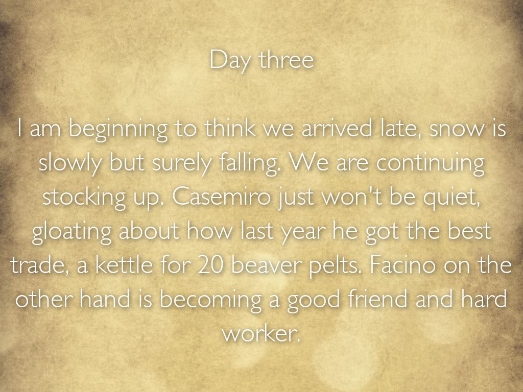 I am beginning to think we arrived late, snow is slowly but surely falling. We are continuing stocking up. Casemiro just won't be quiet, gloating about how last year he got the best trade, a kettle for 20 beaver pelts. Facino on the other hand is becoming a good friend and hard worker.