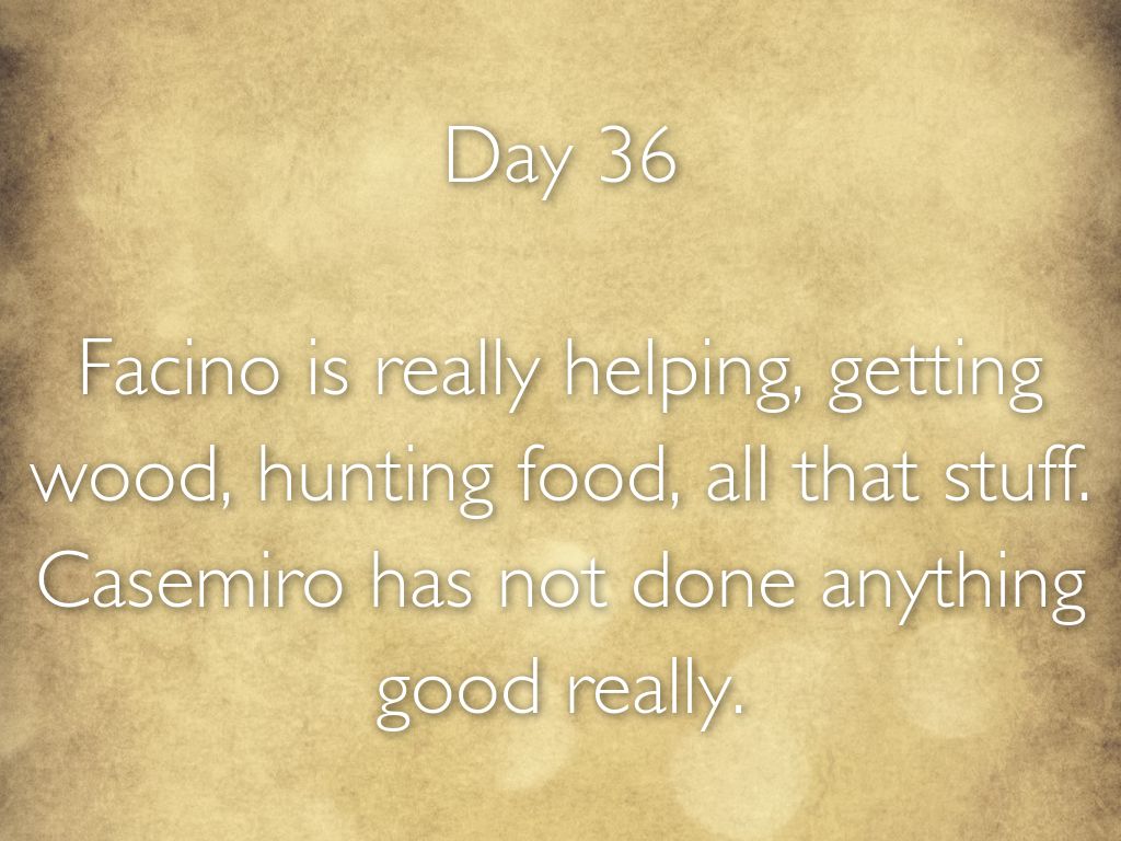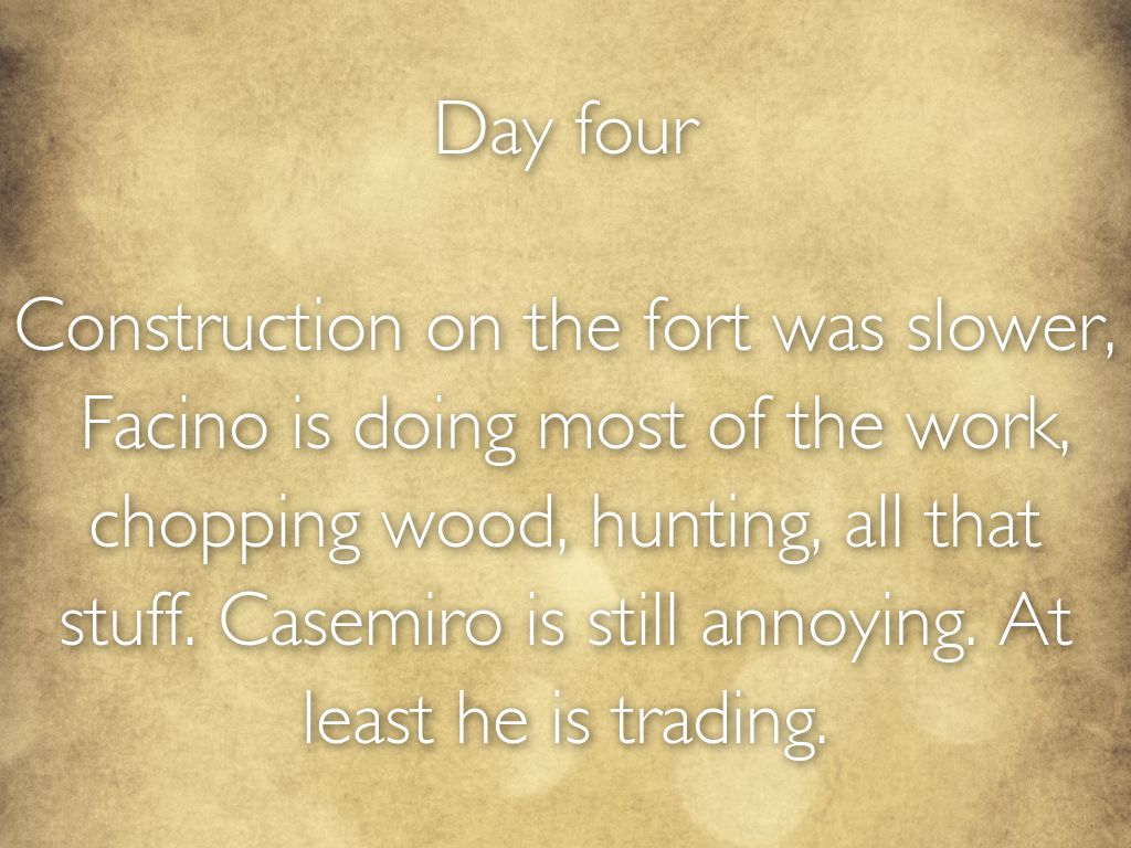 Construction on the fort was slower, Facino is doing most of the work, chopping wood, hunting, all that stuff. Casemiro is still annoying. At least he is trading.