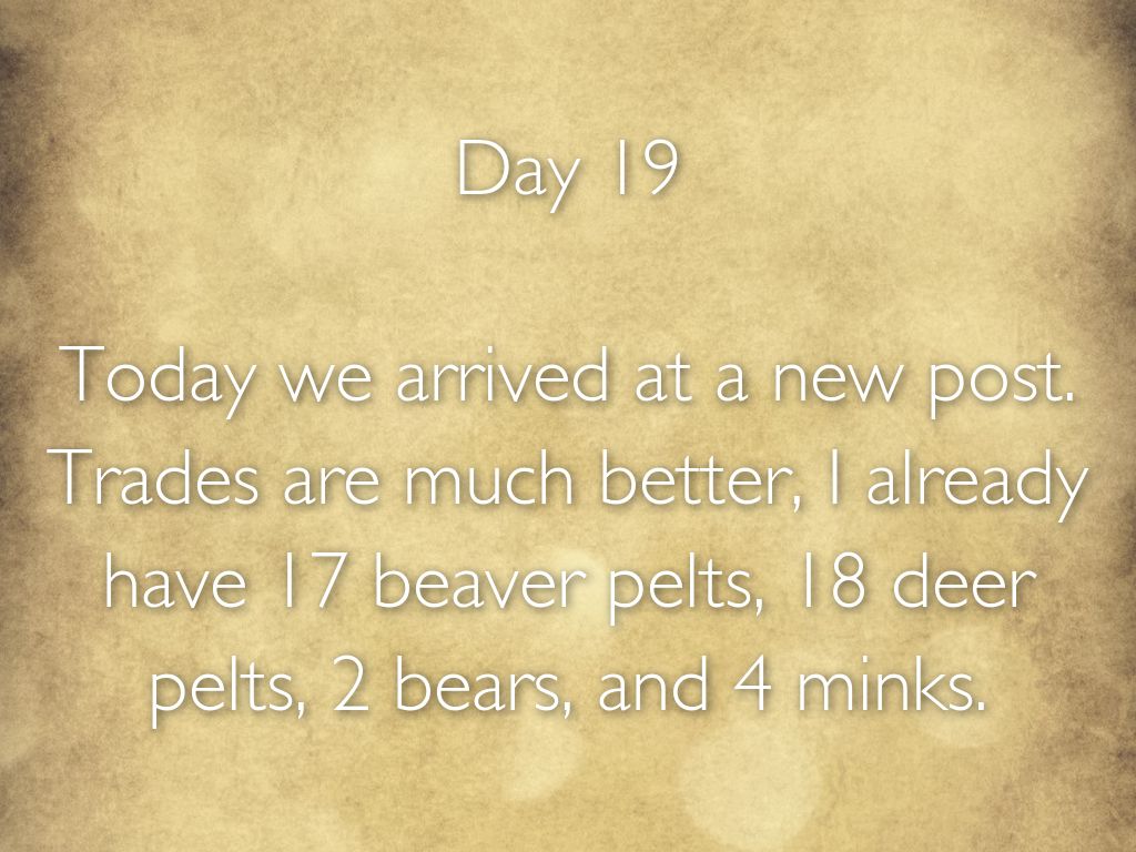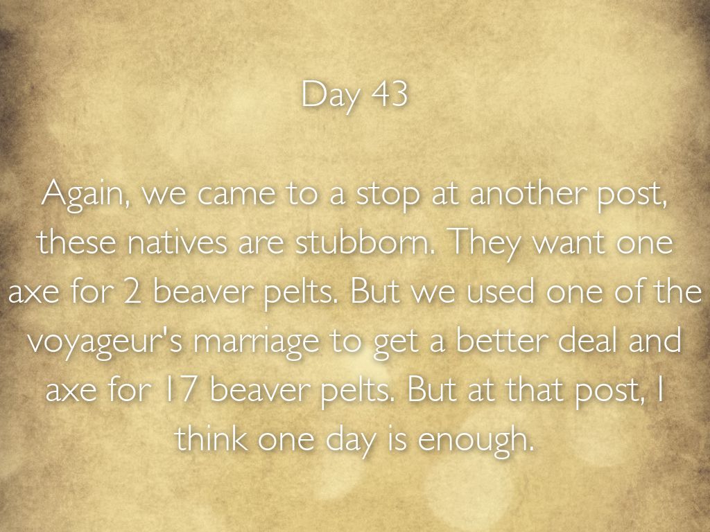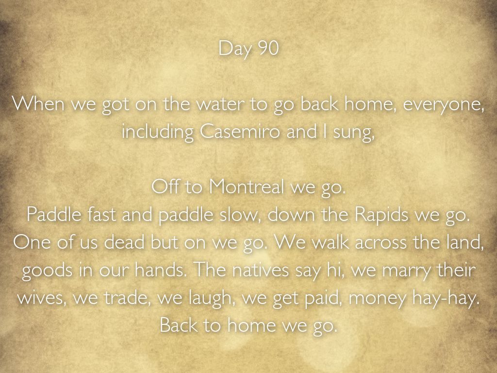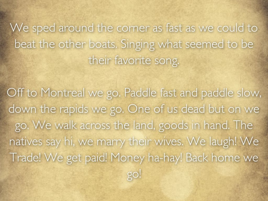 Off to Montreal we go. Paddle fast and paddle slow, down the rapids we go. One of us dead but on we go. We walk across the land, goods in hand. The natives say hi, we marry their wives. We laugh! We Trade! We get paid! Money ha-hay! Back home we go!
