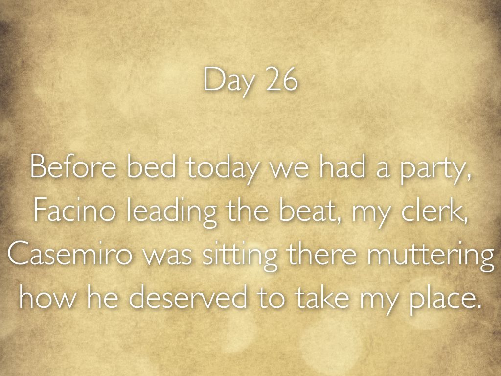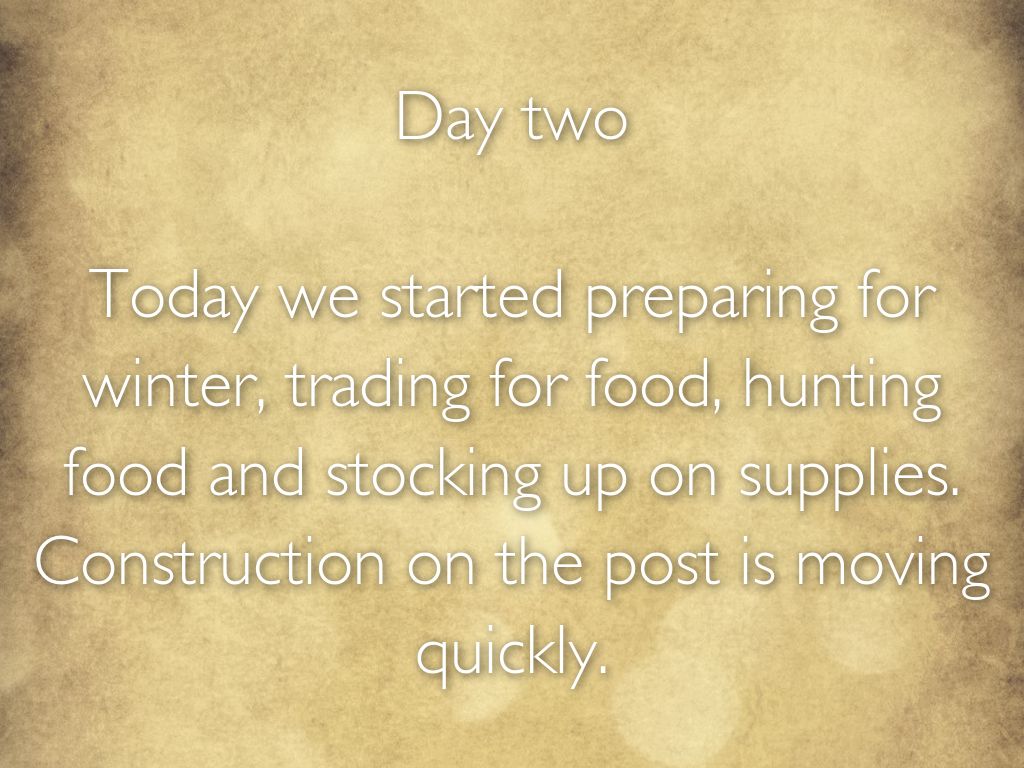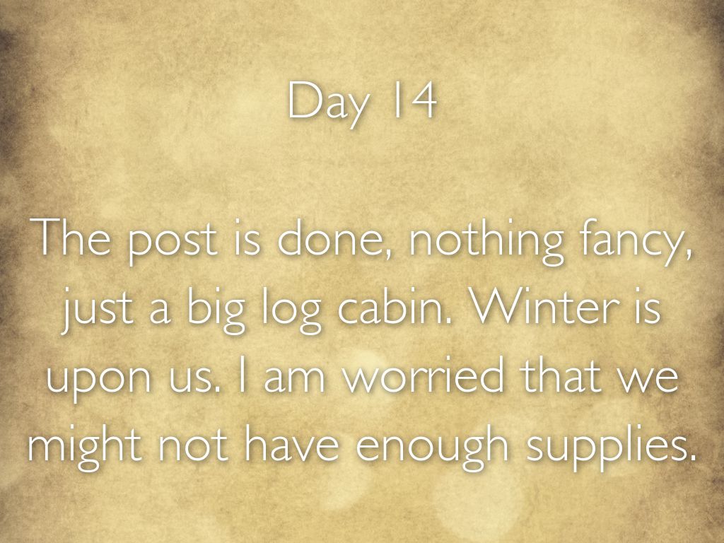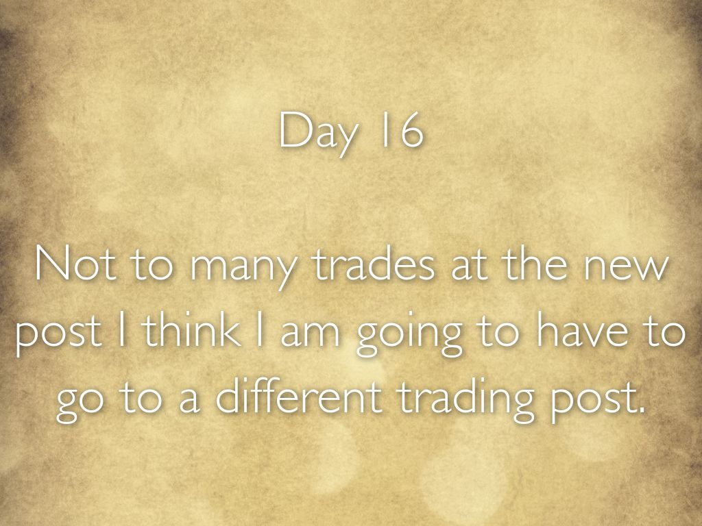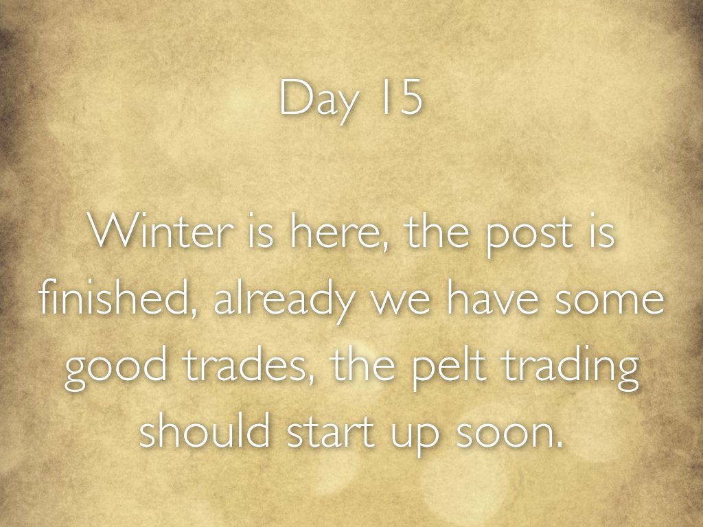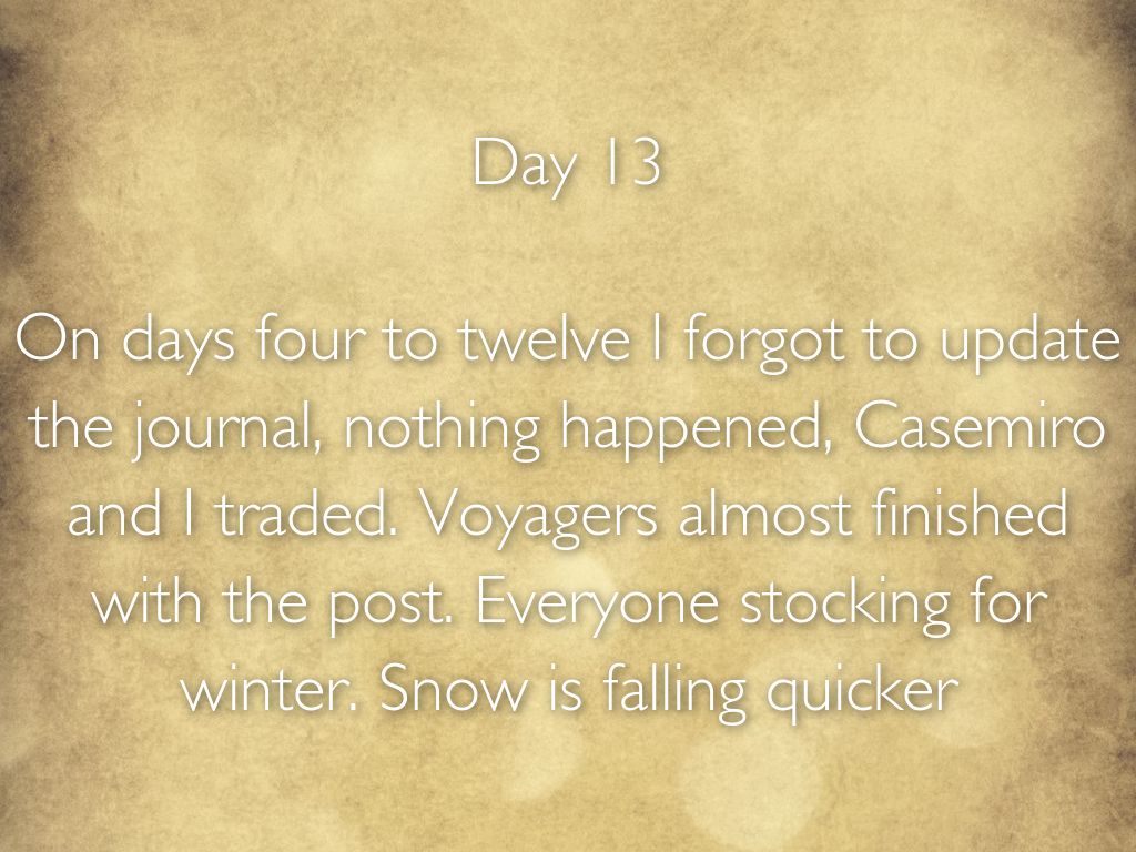 On days four to twelve I forgot to update the journal, nothing happened, Casemiro and I traded. Voyagers almost finished with the post. Everyone stocking for winter. Snow is falling quicker