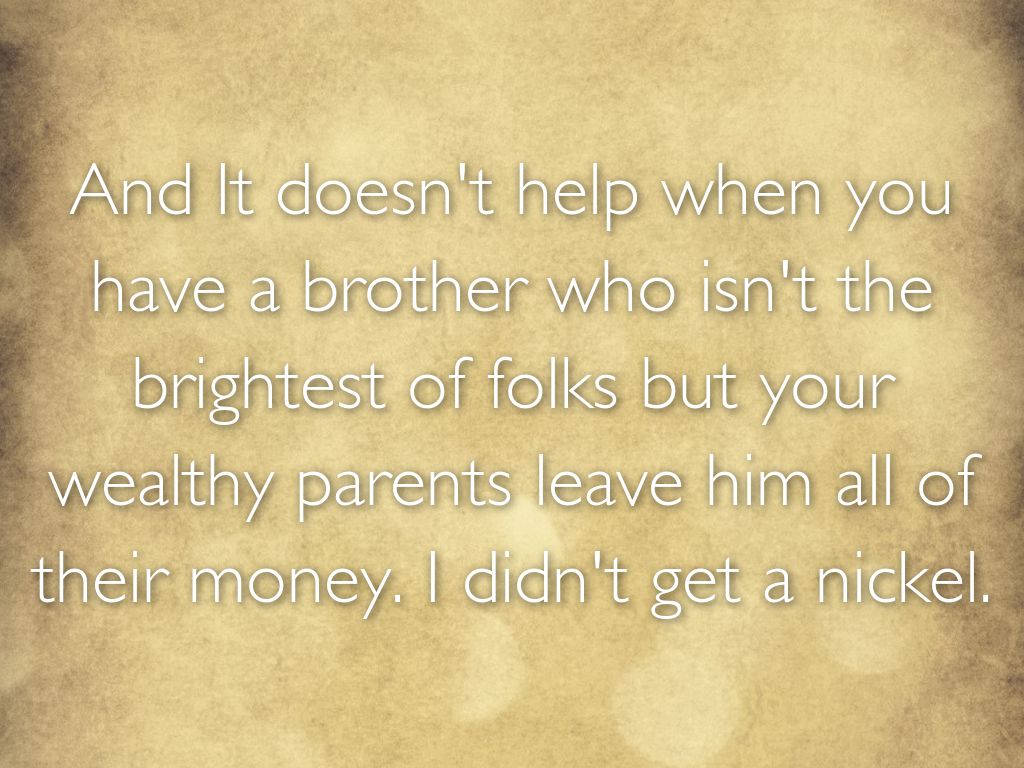 And It doesn't help when you have a brother who isn't the brightest of folks but your wealthy parents leave him all of their money. I didn't get a nickel.