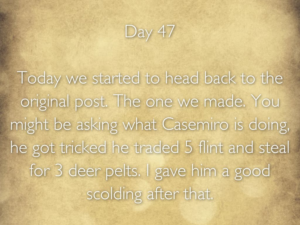 Today we started to head back to the original post. The one we made. You might be asking what Casemiro is doing, he got tricked he traded 5 flint and steal for 3 deer pelts. I gave him a good scolding after that.