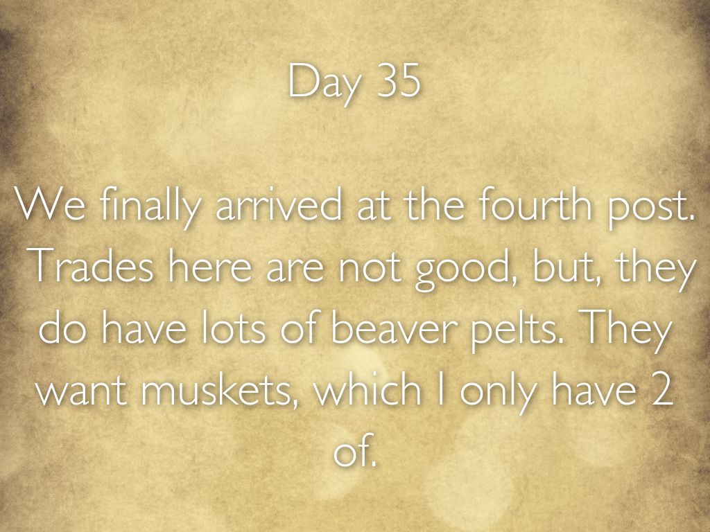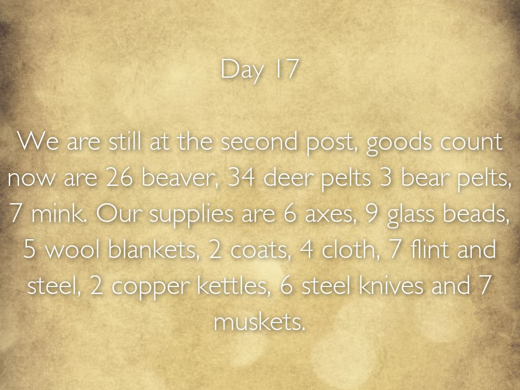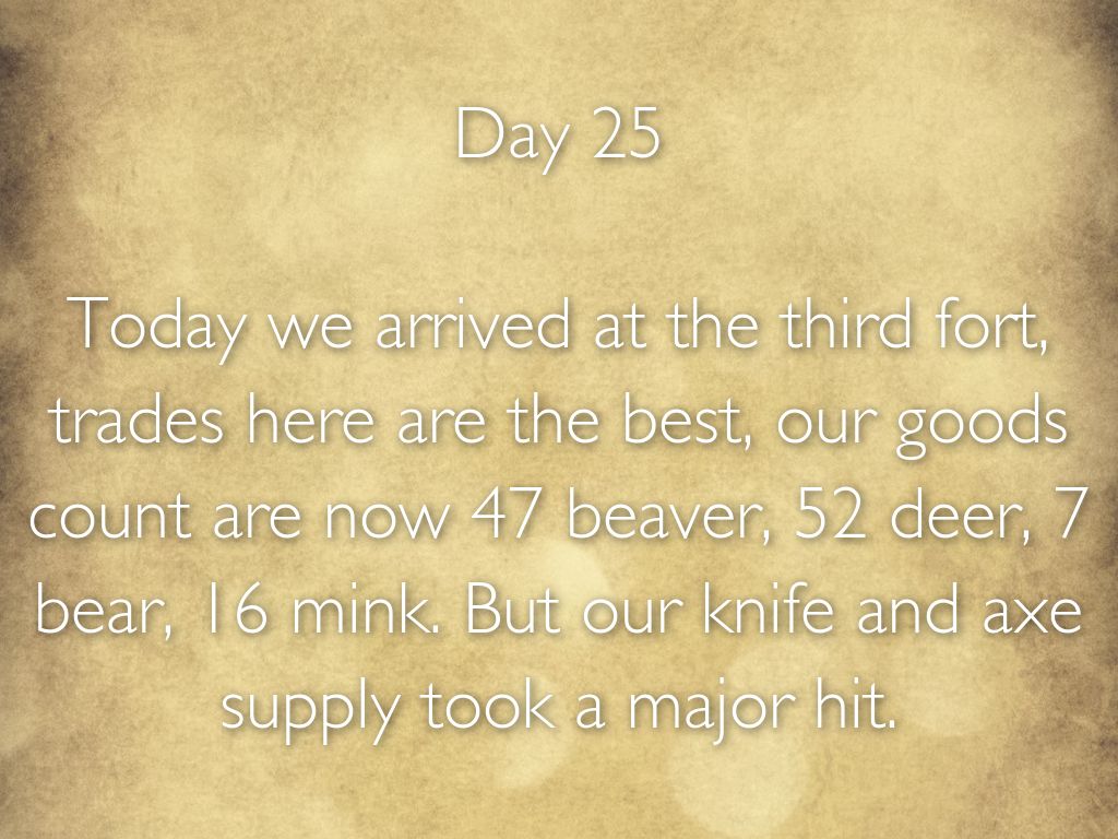 Today we arrived at the third fort, trades here are the best, our goods count are now 47 beaver, 52 deer, 7 bear, 16 mink. But our knife and axe supply took a major hit.