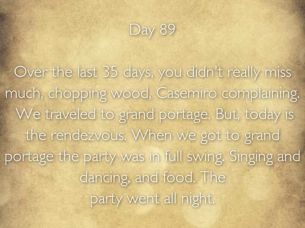 Over the last 35 days, you didn't really miss much, chopping wood, Casemiro complaining. We traveled to grand portage. But, today is the rendezvous. When we got to grand portage the party was in full swing. Singing and dancing, and food. The party went all night.