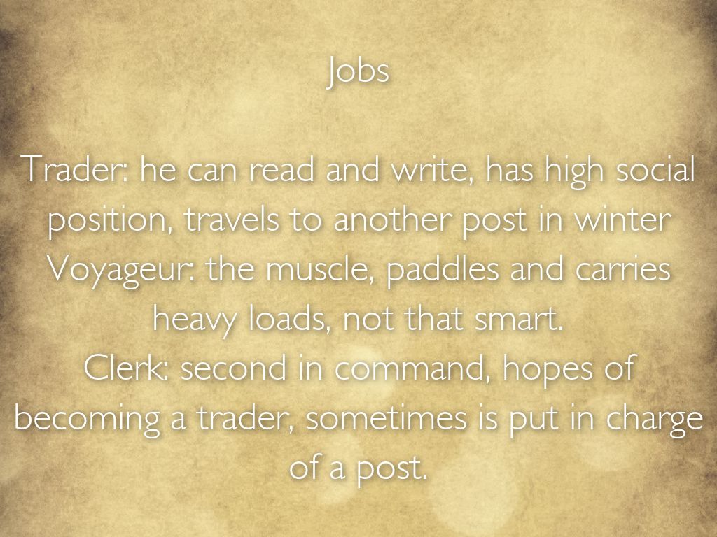Trader: he can read and write, has high social position, travels to another post in winter Voyageur: the muscle, paddles and carries heavy loads, not that smart. Clerk: second in command, hopes of becoming a trader, sometimes is put in charge of a post.