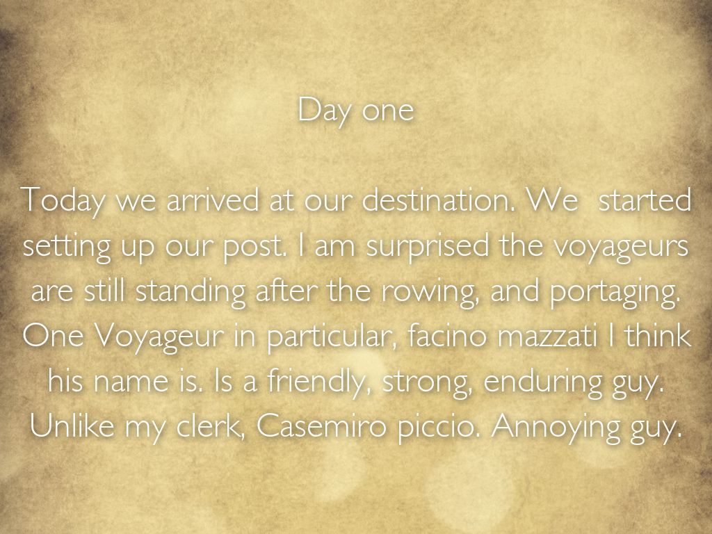 Today we arrived at our destination. We started setting up our post. I am surprised the voyageurs are still standing after the rowing, and portaging. One Voyageur in particular, facino mazzati I think his name is. Is a friendly, strong, enduring guy. Unlike my clerk, Casemiro piccio. Annoying guy.