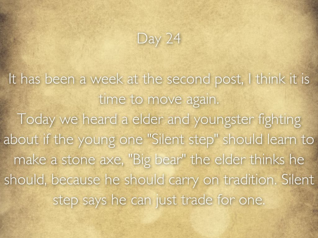 It has been a week at the second post, I think it is time to move again. Today we heard a elder and youngster fighting about if the young one "Silent step" should learn to make a stone axe, "Big bear" the elder thinks he should, because he should carry on tradition. Silent step says he can just trade for one.