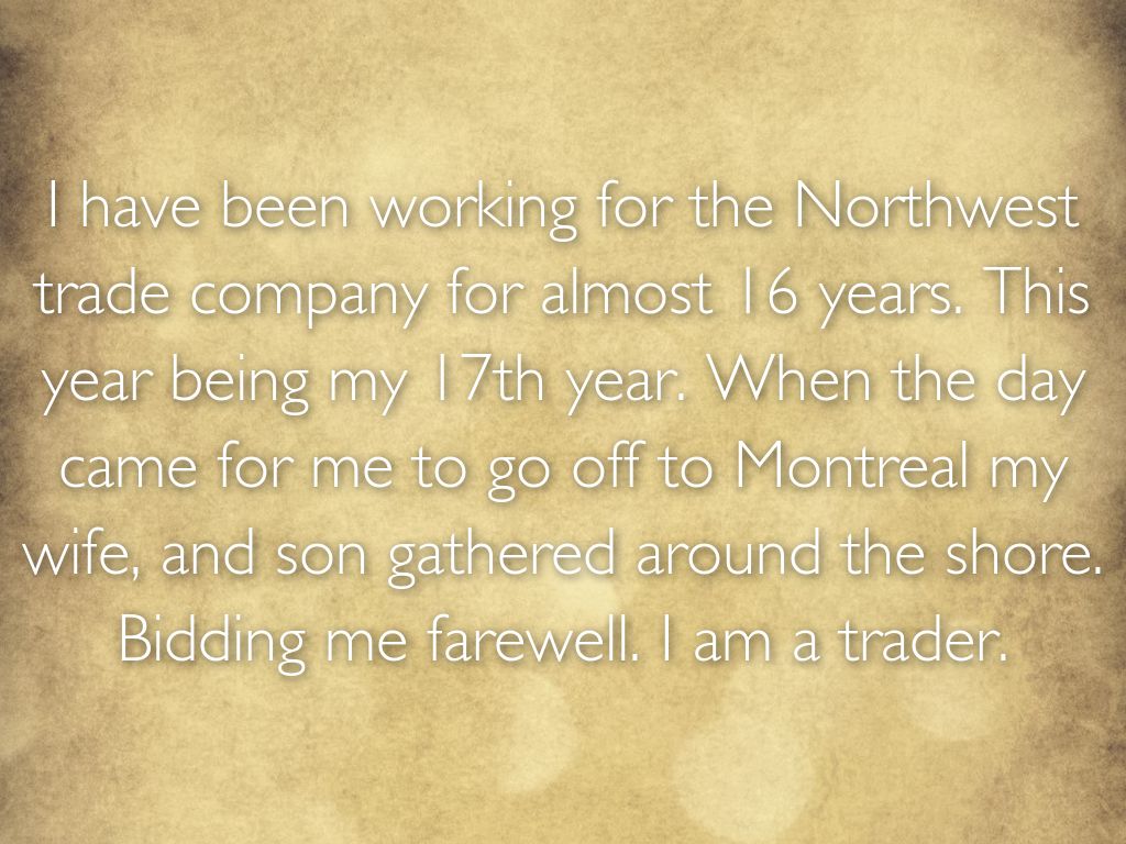 I have been working for the Northwest trade company for almost 16 years. This year being my 17th year. When the day came for me to go off to Montreal my wife, and son gathered around the shore. Bidding me farewell. I am a trader.