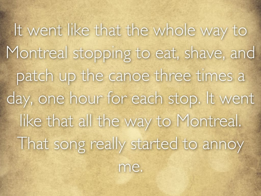 It went like that the whole way to Montreal stopping to eat, shave, and patch up the canoe three times a day, one hour for each stop. It went like that all the way to Montreal. That song really started to annoy me.