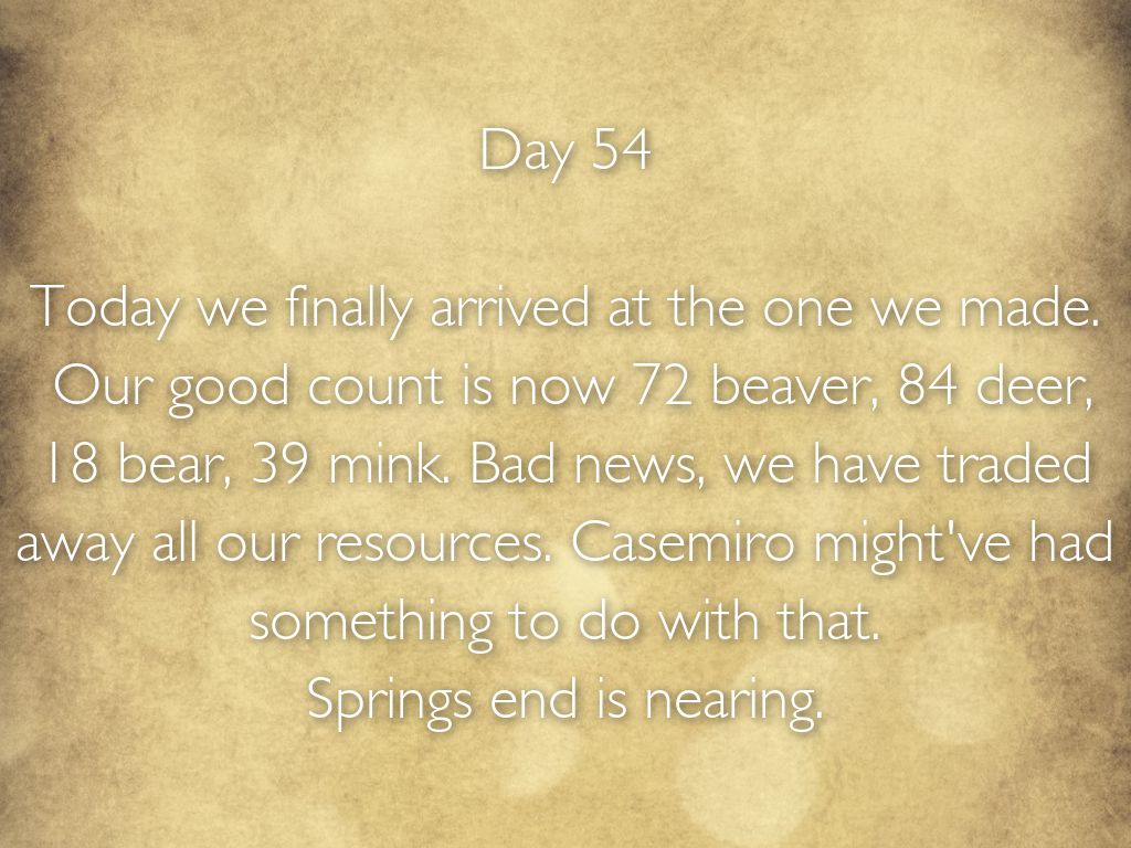 Today we finally arrived at the one we made. Our good count is now 72 beaver, 84 deer, 18 bear, 39 mink. Bad news, we have traded away all our resources. Casemiro might've had something to do with that. Springs end is nearing.