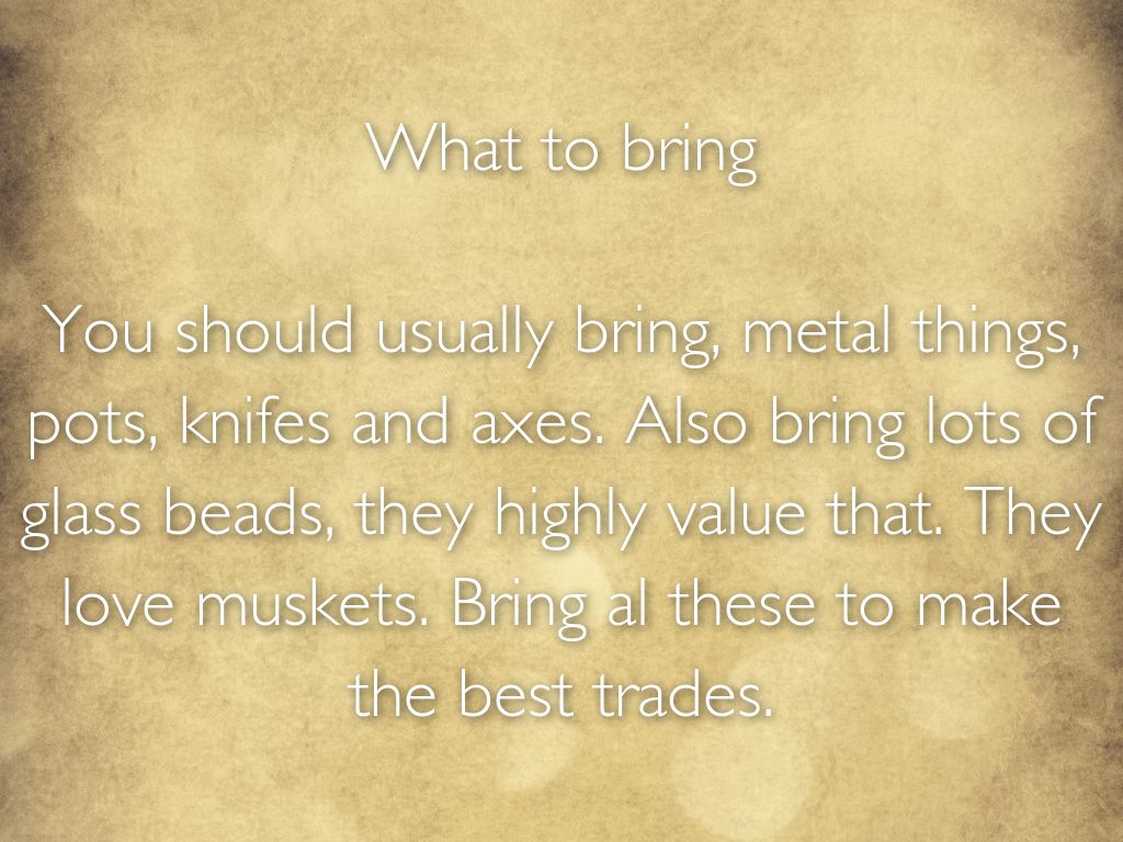 You should usually bring, metal things, pots, knifes and axes. Also bring lots of glass beads, they highly value that. They love muskets. Bring al these to make the best trades.