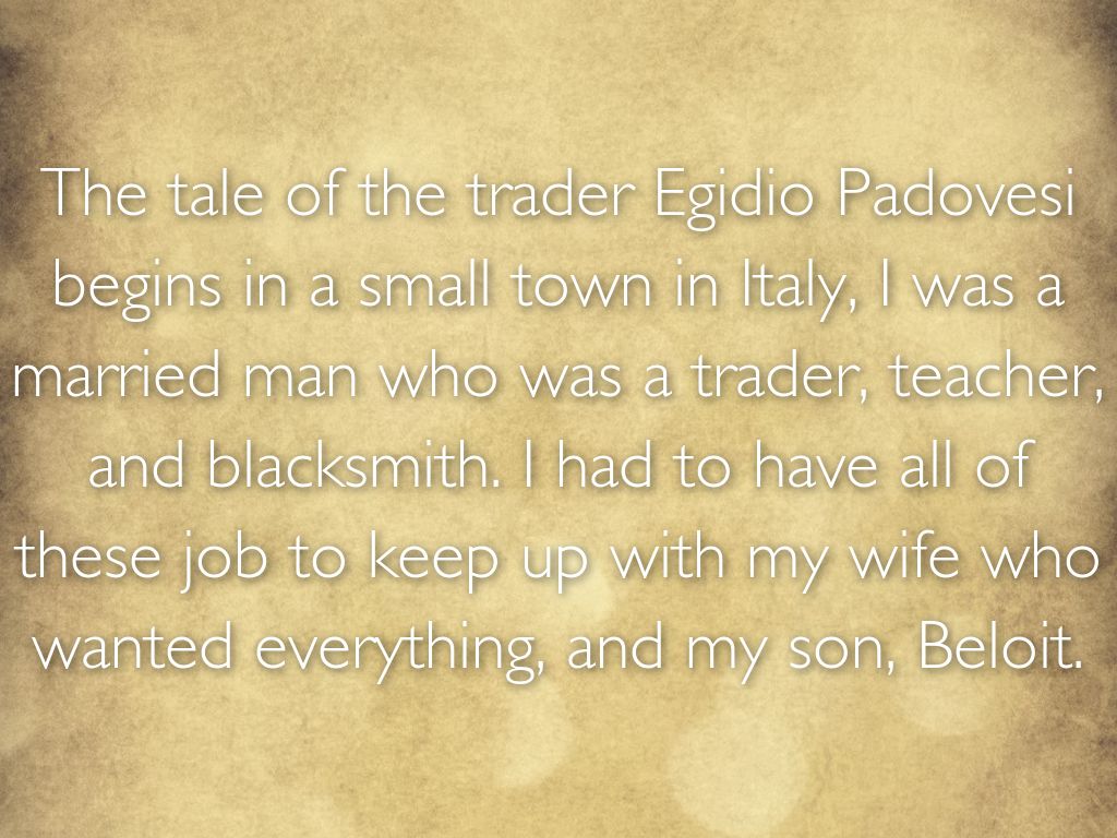 The tale of the trader Egidio Padovesi begins in a small town in Italy, I was a married man who was a trader, teacher, and blacksmith. I had to have all of these job to keep up with my wife who wanted everything, and my son, Beloit.