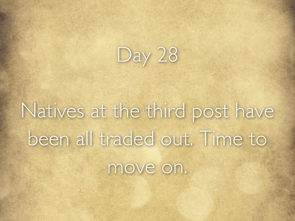 Again, we came to a stop at another post, these natives are stubborn. They want one axe for 2 beaver pelts. But we used one of the voyageur's marriage to get a better deal and axe for 17 beaver pelts. But at that post, I think one day is enough.
