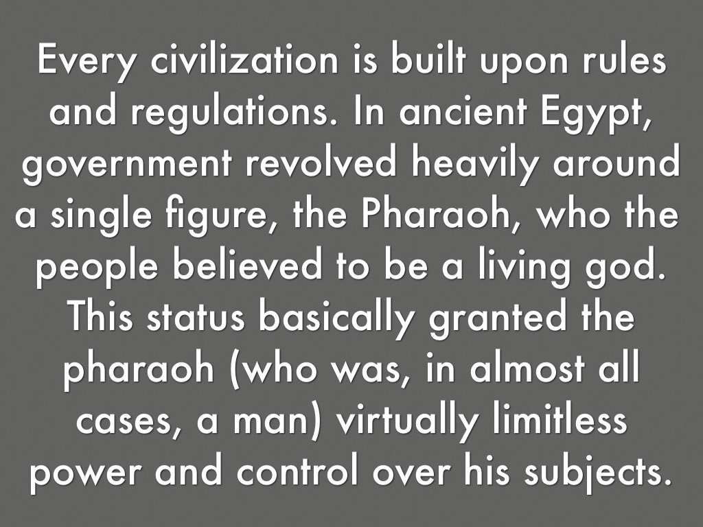 Every civilization is built upon rules and regulations. In ancient Egypt, government revolved heavily around a single figure, the Pharaoh, who the people believed to be a living god. This status basically granted the pharaoh (who was, in almost all cases, a man) virtually limitless power and control over his subjects.
