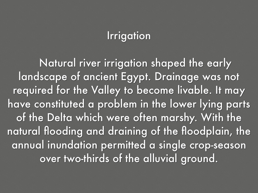 Natural river irrigation shaped the early landscape of ancient Egypt. Drainage was not required for the Valley to become livable. It may have constituted a problem in the lower lying parts of the Delta which were often marshy. With the natural flooding and draining of the floodplain, the annual inundation permitted a single crop-season over two-thirds of the alluvial ground.