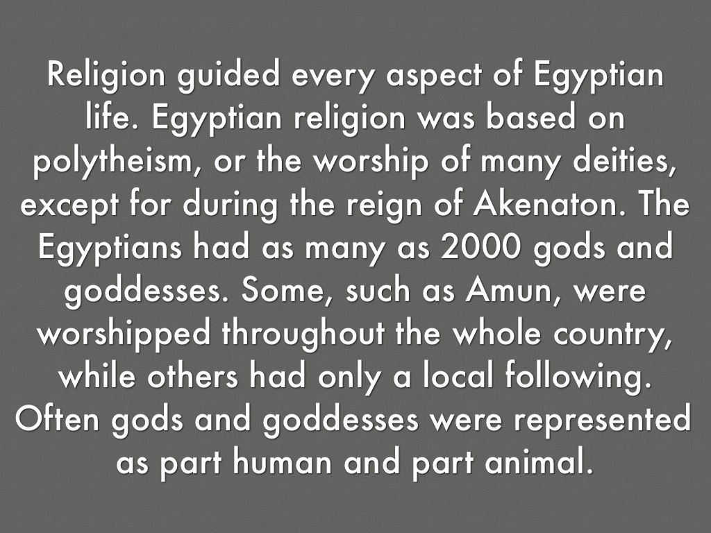 Religion guided every aspect of Egyptian life. Egyptian religion was based on polytheism, or the worship of many deities, except for during the reign of Akenaton. The Egyptians had as many as 2000 gods and goddesses. Some, such as Amun, were worshipped throughout the whole country, while others had only a local following. Often gods and goddesses were represented as part human and part animal.