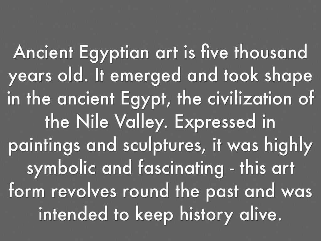 Ancient Egyptian art is five thousand years old. It emerged and took shape in the ancient Egypt, the civilization of the Nile Valley. Expressed in paintings and sculptures, it was highly symbolic and fascinating - this art form revolves round the past and was intended to keep history alive.