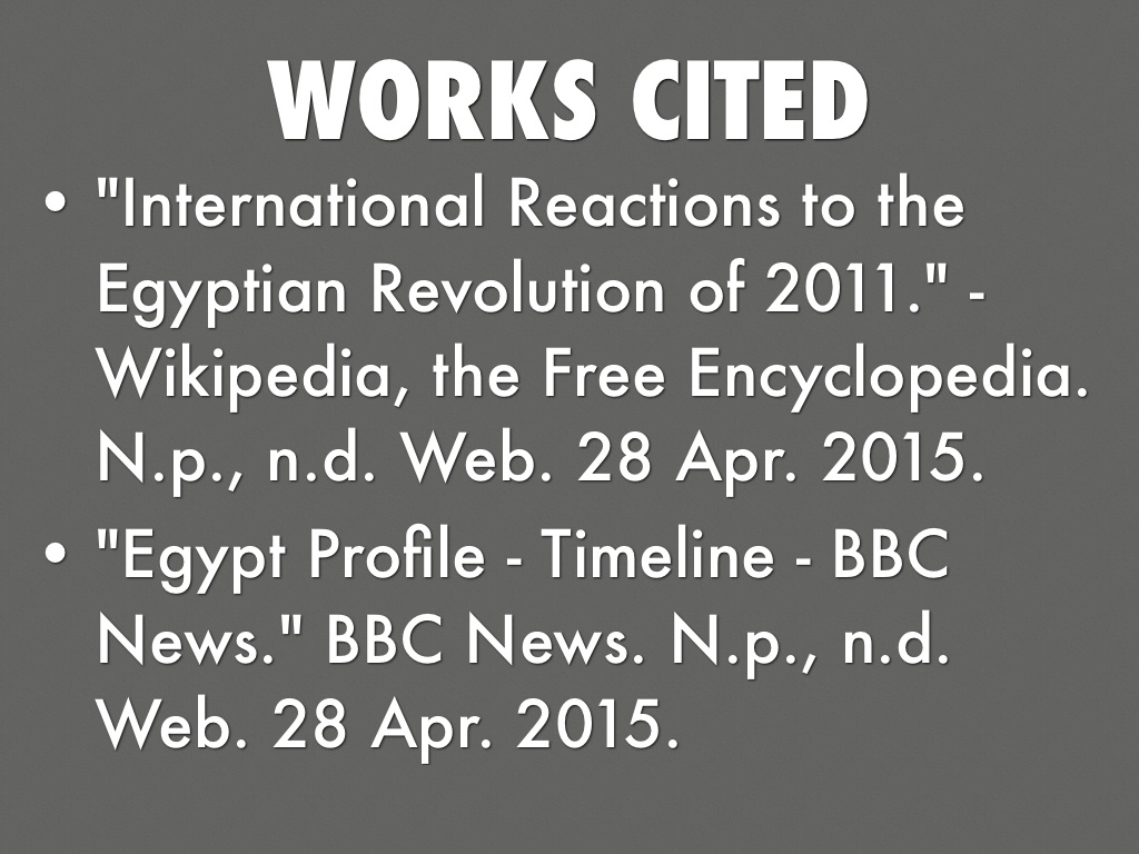 "International Reactions to the Egyptian Revolution of 2011." - Wikipedia, the Free Encyclopedia. N.p., n.d. Web. 28 Apr. 2015.