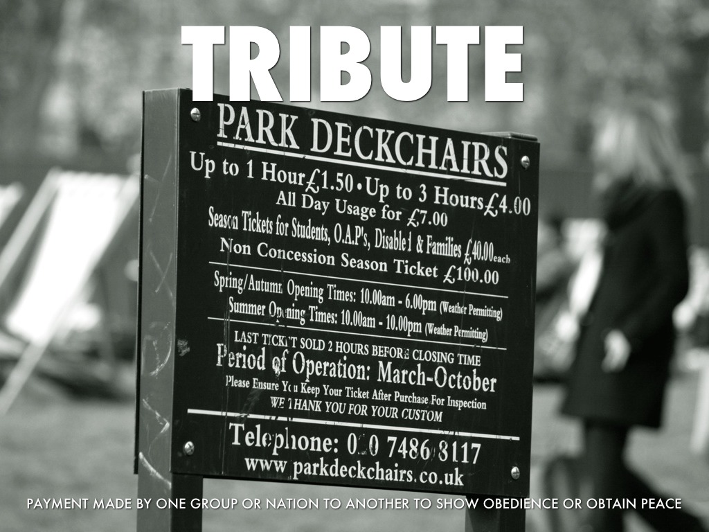 Payment made by one group or nation to another to show obedience or obtain peace
