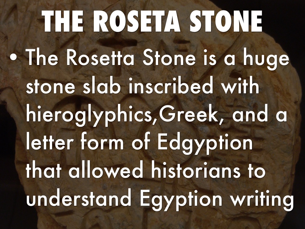 The Rosetta Stone is a huge stone slab inscribed with hieroglyphics,Greek, and a letter form of Edgyption that allowed historians to understand Egyption writing