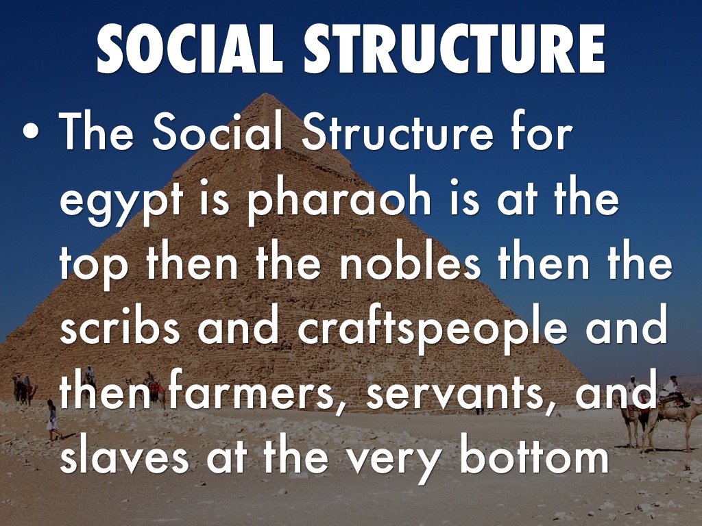 The Social Structure for egypt is pharaoh is at the top then the nobles then the scribs and craftspeople and then farmers, servants, and slaves at the very bottom