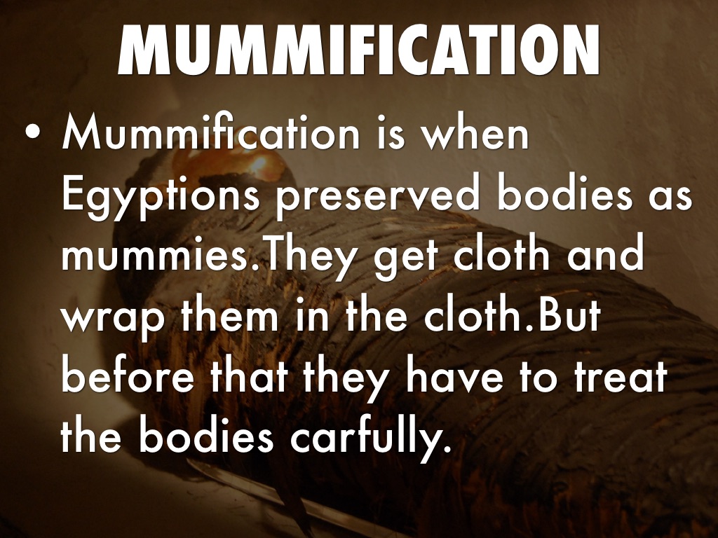 Mummification is when Egyptions preserved bodies as mummies.They get cloth and wrap them in the cloth.But before that they have to treat the bodies carfully.