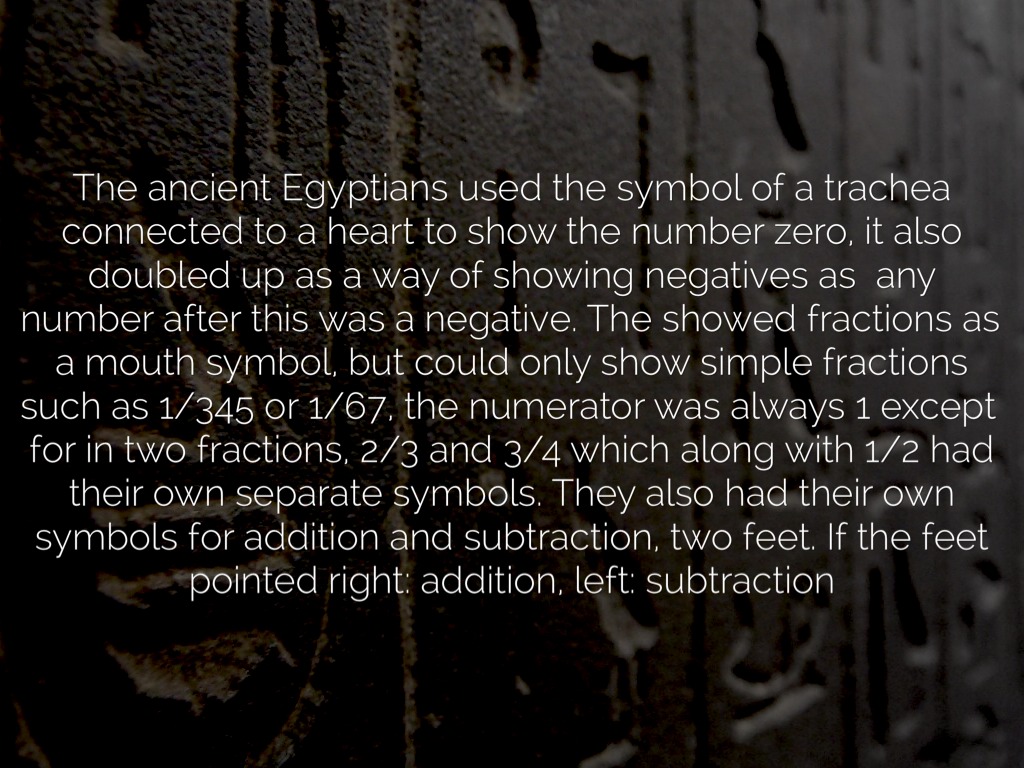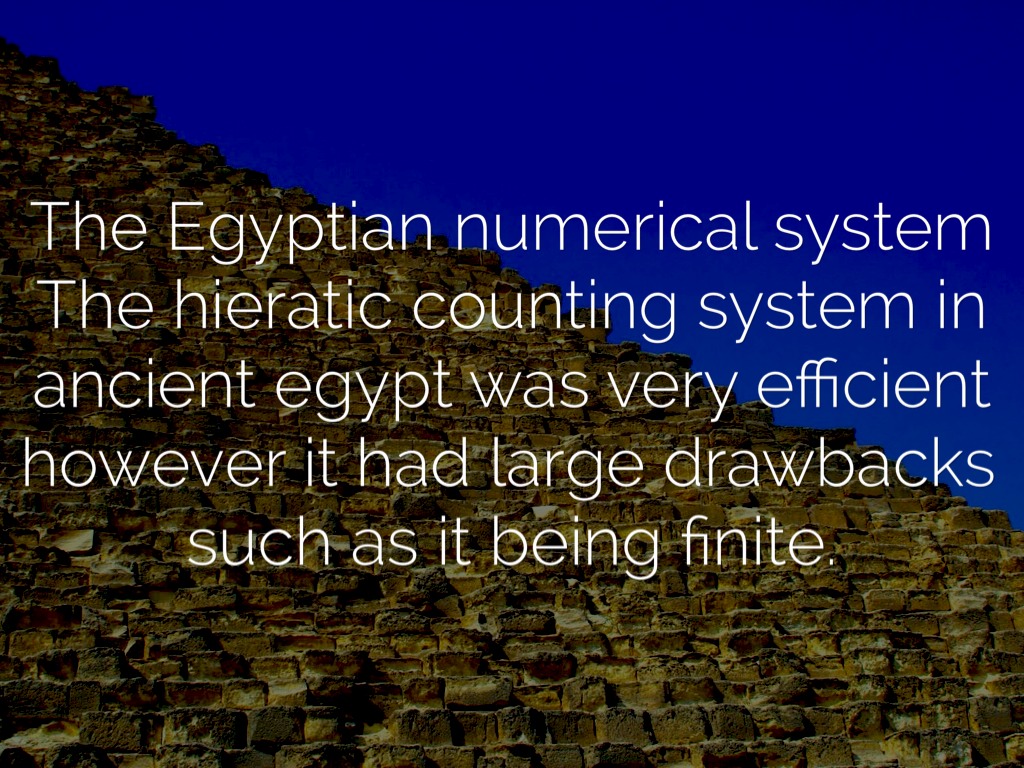 The Roman numerals were loosely based off of the Egyptian numerical system, using single figures to show numbers in powers of 10. However the Egyptian was also slightly more advanced they had two ways in which to represent their data. Both in written numbers and through words, not only that but they could show fractions, negatives and decimals.
