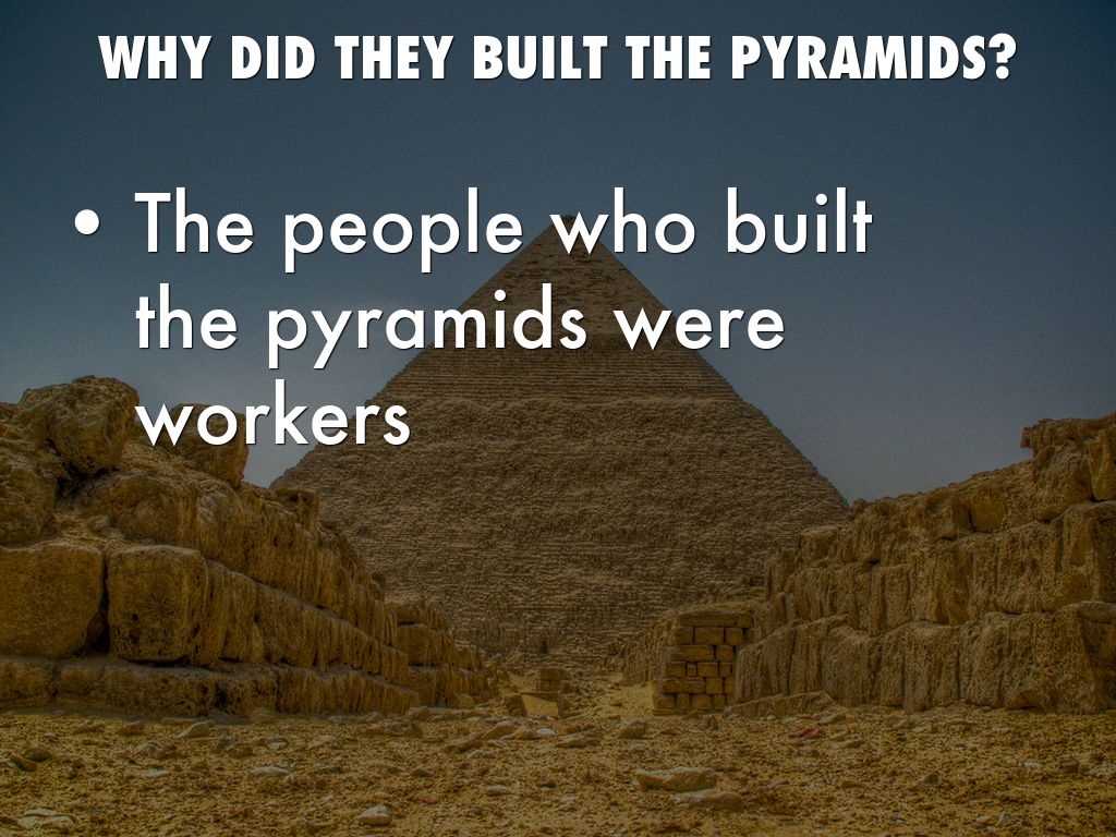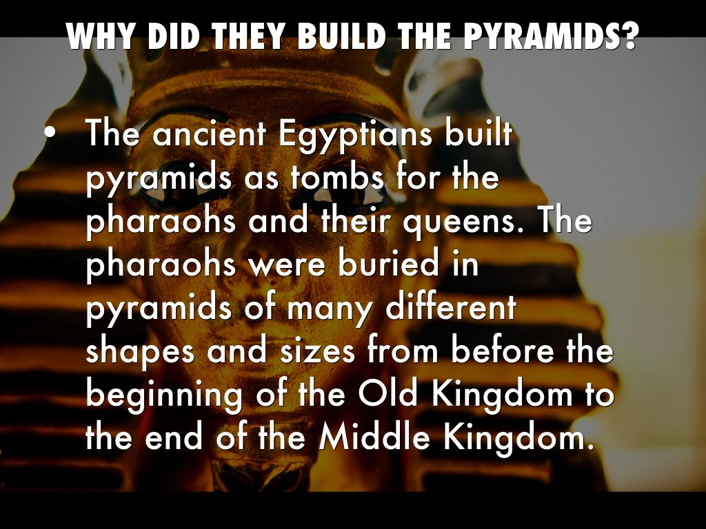 The ancient Egyptians built pyramids as tombs for the pharaohs and their queens. The pharaohs were buried in pyramids of many different shapes and sizes from before the beginning of the Old Kingdom to the end of the Middle Kingdom.