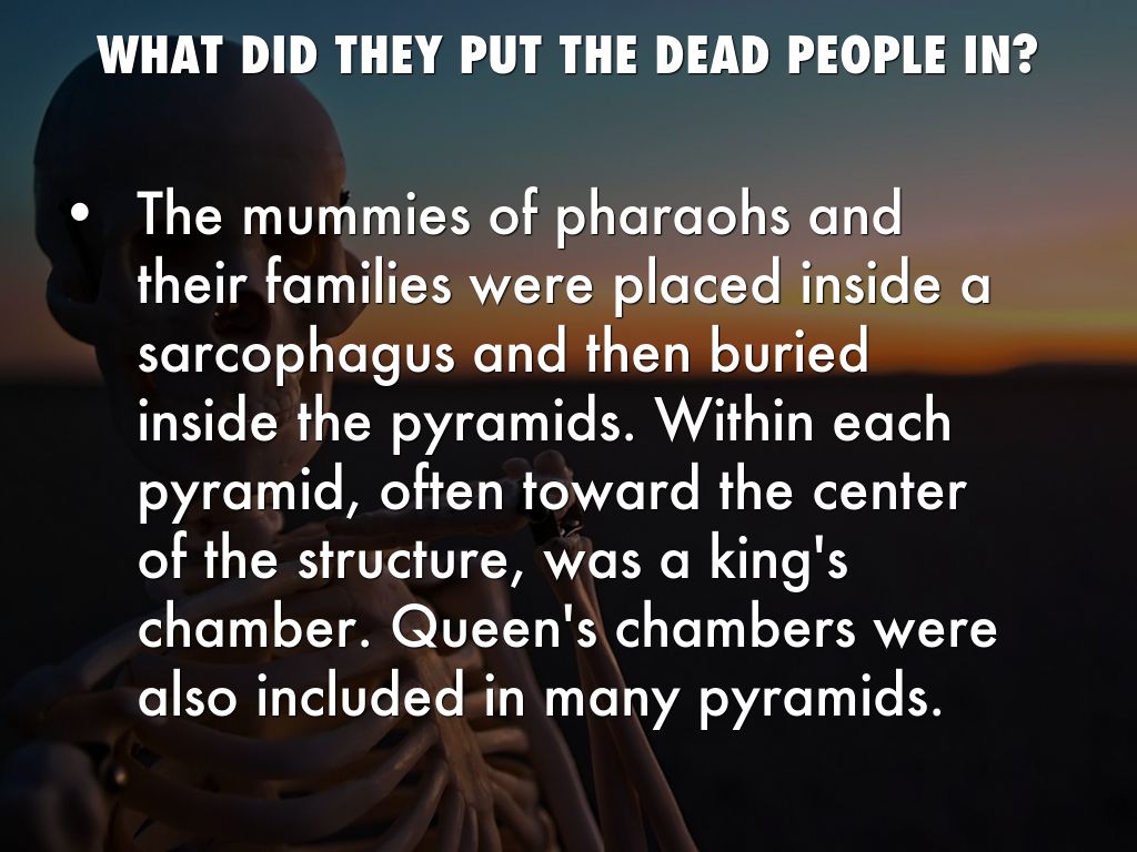 The mummies of pharaohs and their families were placed inside a sarcophagus and then buried inside the pyramids. Within each pyramid, often toward the center of the structure, was a king's chamber. Queen's chambers were also included in many pyramids.