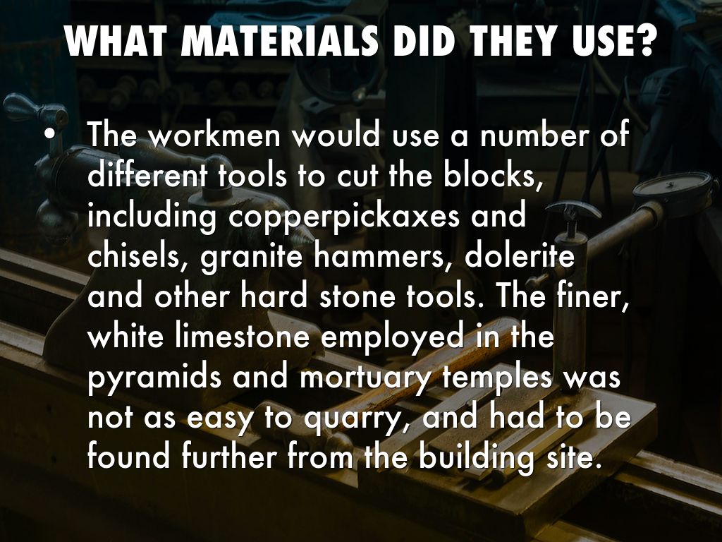 The workmen would use a number of different tools to cut the blocks, including copperpickaxes and chisels, granite hammers, dolerite and other hard stone tools. The finer, white limestone employed in the pyramids and mortuary temples was not as easy to quarry, and had to be found further from the building site.