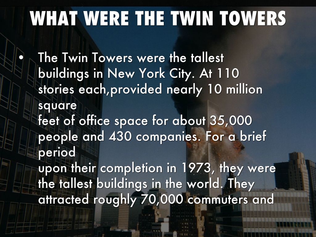 The Twin Towers were the tallest buildings in New York City. At 110 stories each,provided nearly 10 million square