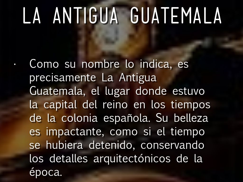 Como su nombre lo indica, es precisamente La Antigua Guatemala, el lugar donde estuvo la capital del reino en los tiempos de la colonia española. Su belleza es impactante, como si el tiempo se hubiera detenido, conservando los detalles arquitectónicos de la época.