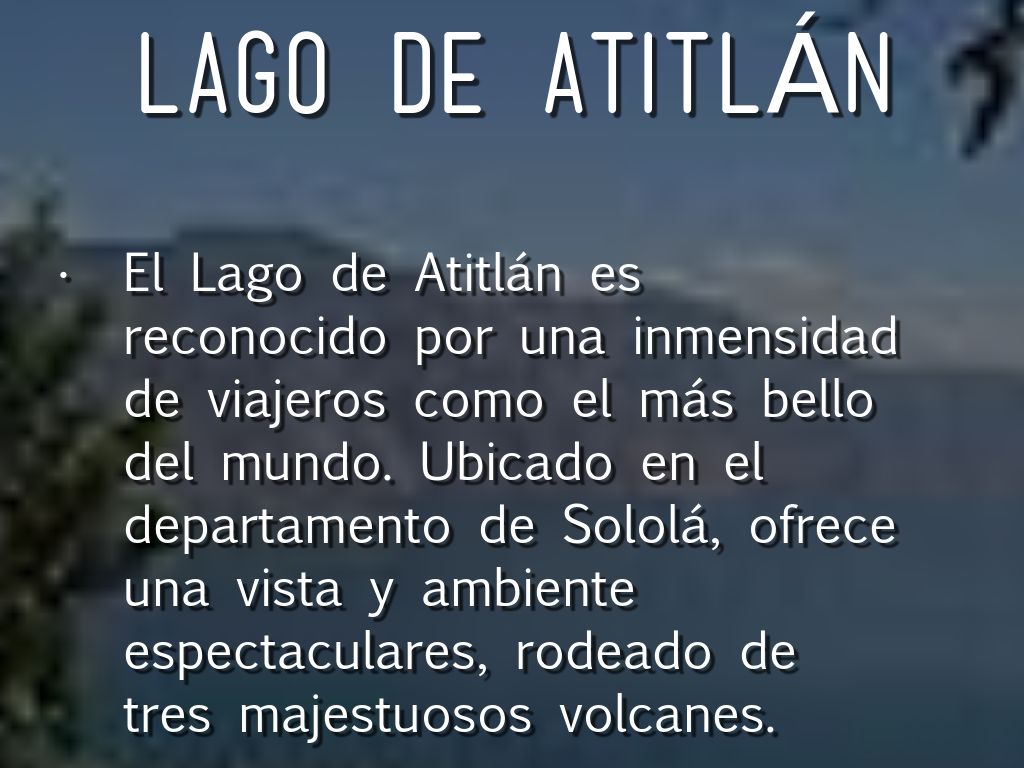 El Lago de Atitlán es reconocido por una inmensidad de viajeros como el más bello del mundo. Ubicado en el departamento de Sololá, ofrece una vista y ambiente espectaculares, rodeado de tres majestuosos volcanes.