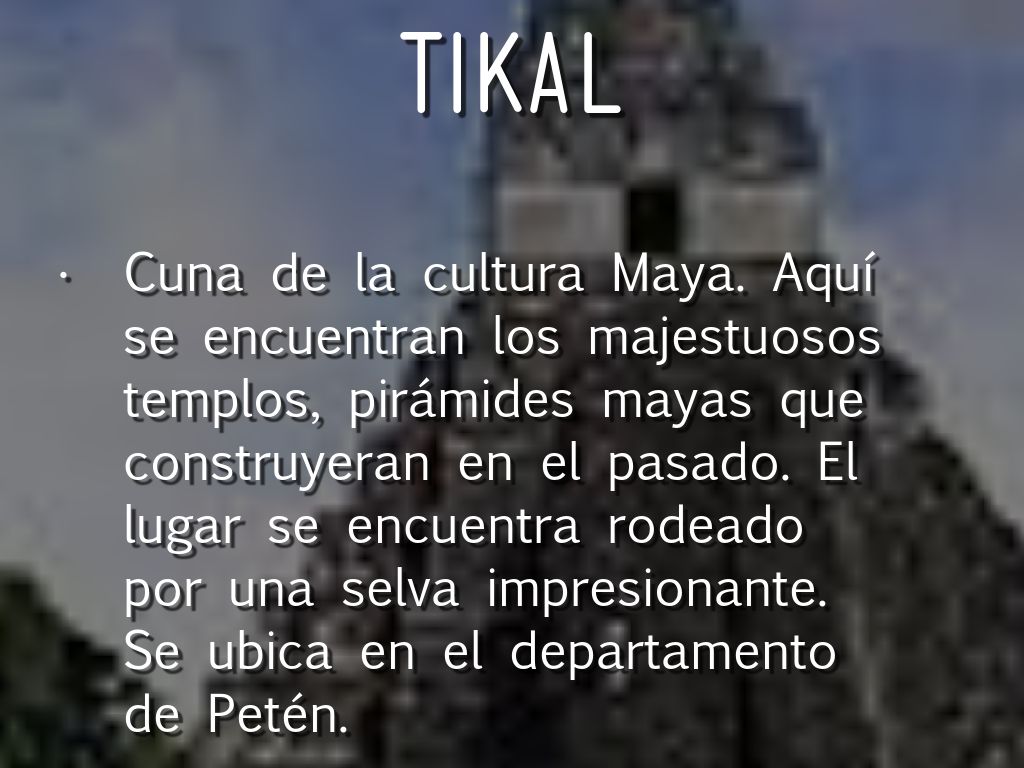 Cuna de la cultura Maya. Aquí se encuentran los majestuosos templos, pirámides mayas que construyeran en el pasado. El lugar se encuentra rodeado por una selva impresionante. Se ubica en el departamento de Petén.