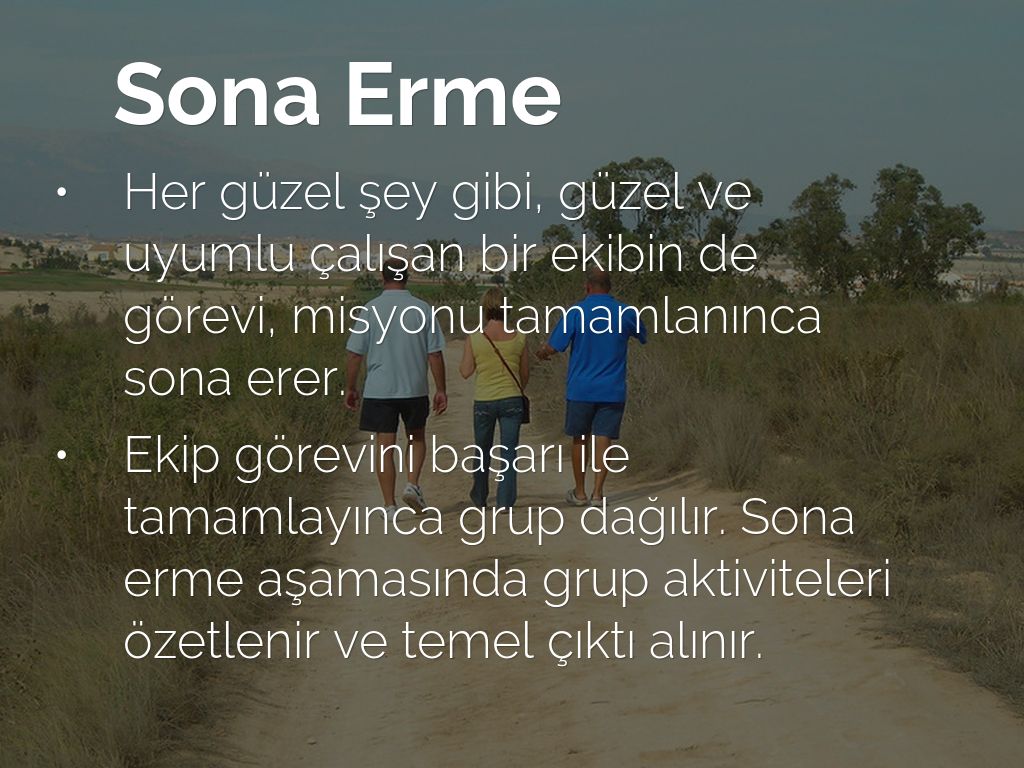 - Ekip görevini başarı ile tamamlayınca grup dağılır. Sona erme aşamasında grup aktiviteleri özetlenir ve temel çıktı alınır.
