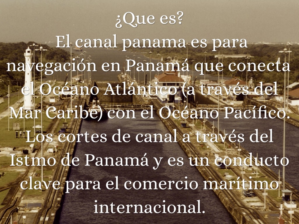 ¿Que es? El canal panama es para navegación en Panamá que conecta el Océano Atlántico (a través del Mar Caribe) con el Océano Pacífico. Los cortes de canal a través del Istmo de Panamá y es un conducto clave para el comercio marítimo internacional.