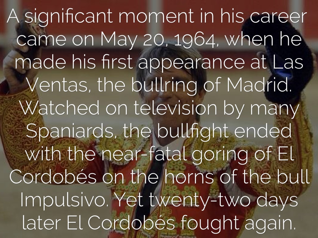 A significant moment in his career came on May 20, 1964, when he made his first appearance at Las Ventas, the bullring of Madrid. Watched on television by many Spaniards, the bullfight ended with the near-fatal goring of El Cordobés on the horns of the bull Impulsivo. Yet twenty-two days later El Cordobés fought again.