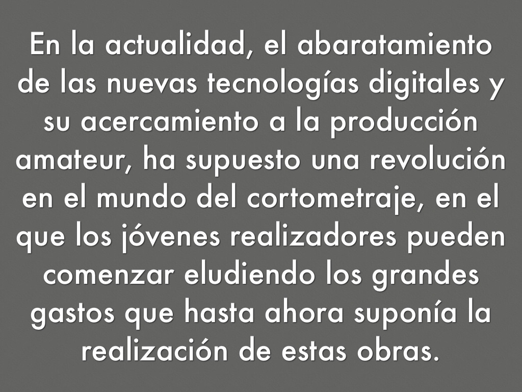 En la actualidad, el abaratamiento de las nuevas tecnologías digitales y su acercamiento a la producción amateur, ha supuesto una revolución en el mundo del cortometraje, en el que los jóvenes realizadores pueden comenzar eludiendo los grandes gastos que hasta ahora suponía la realización de estas obras.