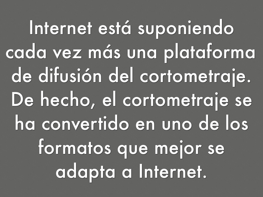 Internet está suponiendo cada vez más una plataforma de difusión del cortometraje. De hecho, el cortometraje se ha convertido en uno de los formatos que mejor se adapta a Internet.
