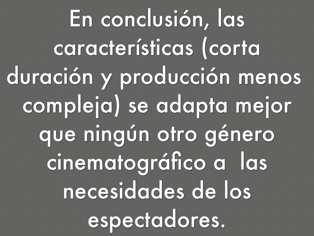 En conclusión, las características (corta duración y producción menos compleja) se adapta mejor que ningún otro género cinematográfico a las necesidades de los espectadores.