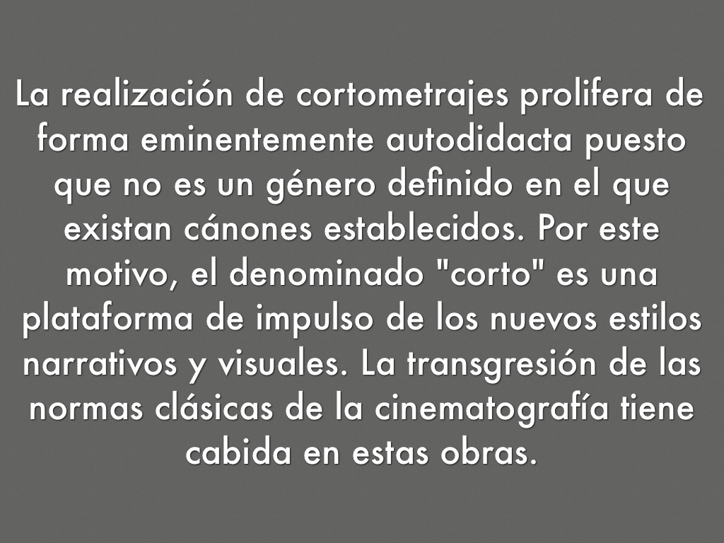 La realización de cortometrajes prolifera de forma eminentemente autodidacta puesto que no es un género definido en el que existan cánones establecidos. Por este motivo, el denominado "corto" es una plataforma de impulso de los nuevos estilos narrativos y visuales. La transgresión de las normas clásicas de la cinematografía tiene cabida en estas obras.