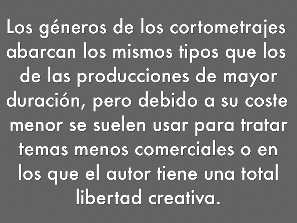 Los géneros de los cortometrajes abarcan los mismos tipos que los de las producciones de mayor duración, pero debido a su coste menor se suelen usar para tratar temas menos comerciales o en los que el autor tiene una total libertad creativa.