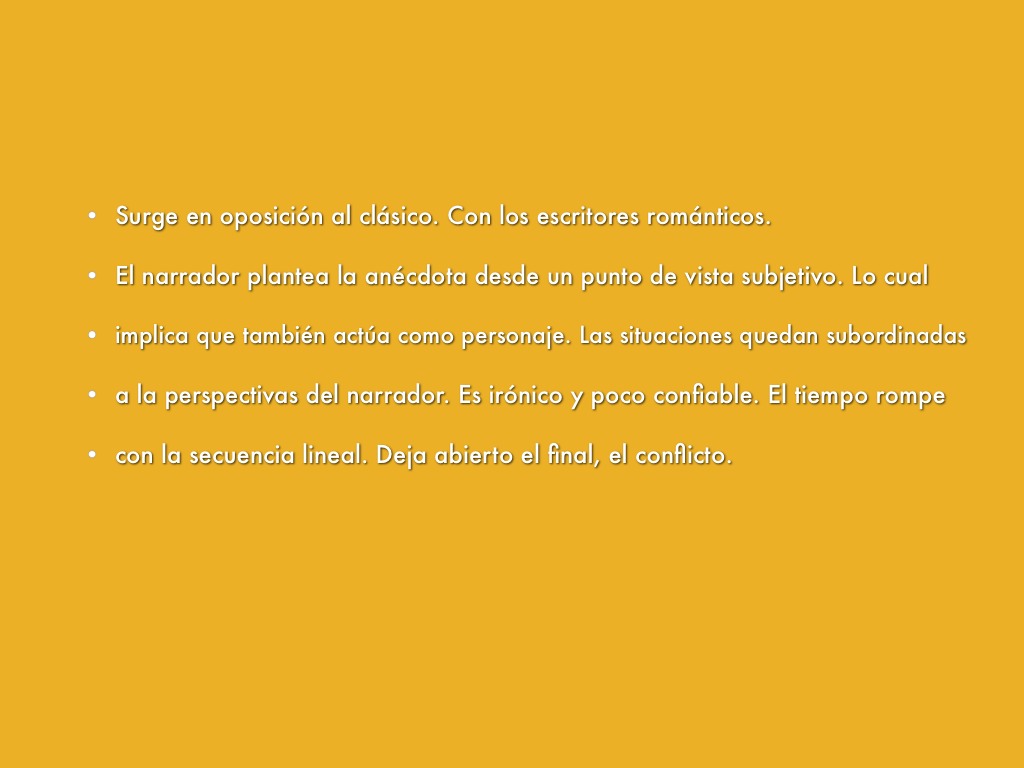 a la perspectivas del narrador. Es irónico y poco confiable. El tiempo rompe