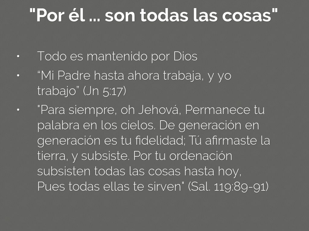 "Para siempre, oh Jehová, Permanece tu palabra en los cielos. De generación en generación es tu fidelidad; Tú afirmaste la tierra, y subsiste. Por tu ordenación subsisten todas las cosas hasta hoy, Pues todas ellas te sirven" (Sal. 119:89-91)