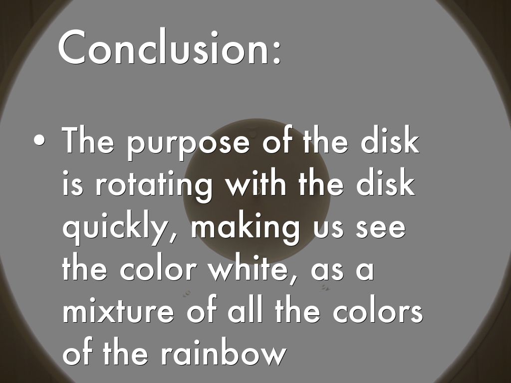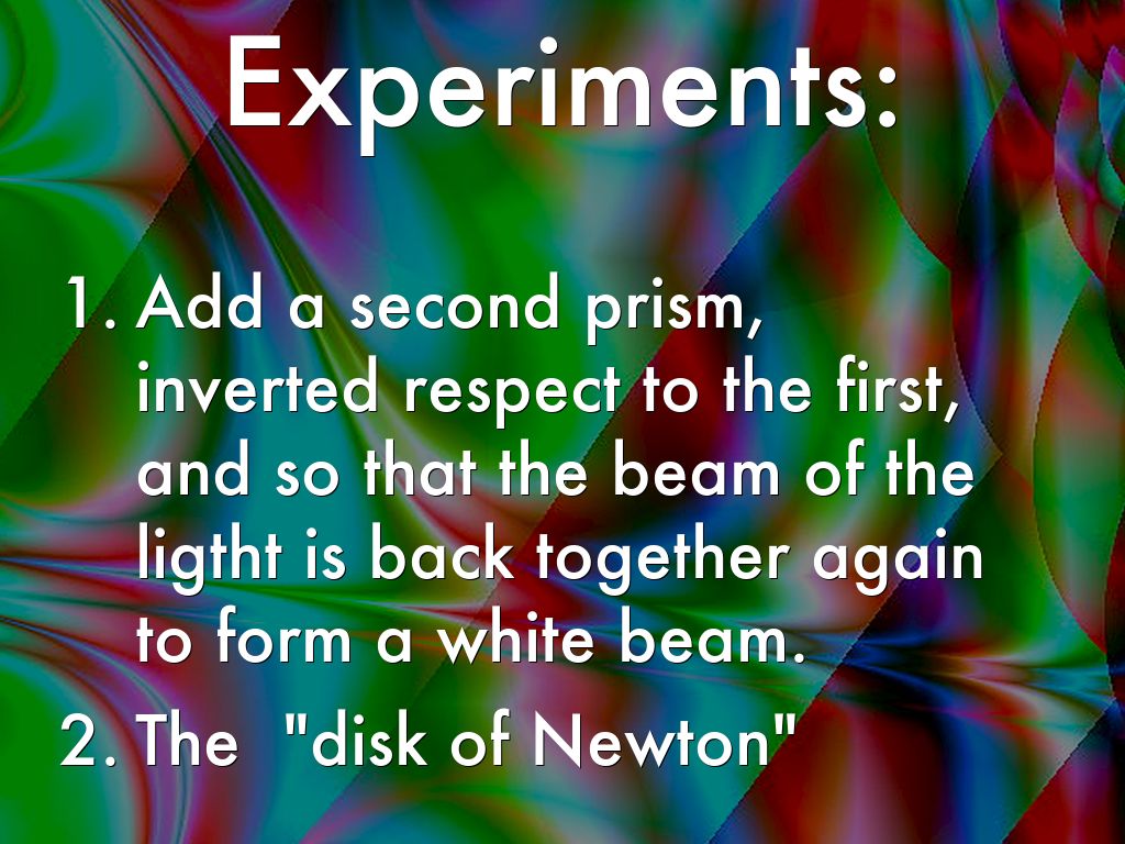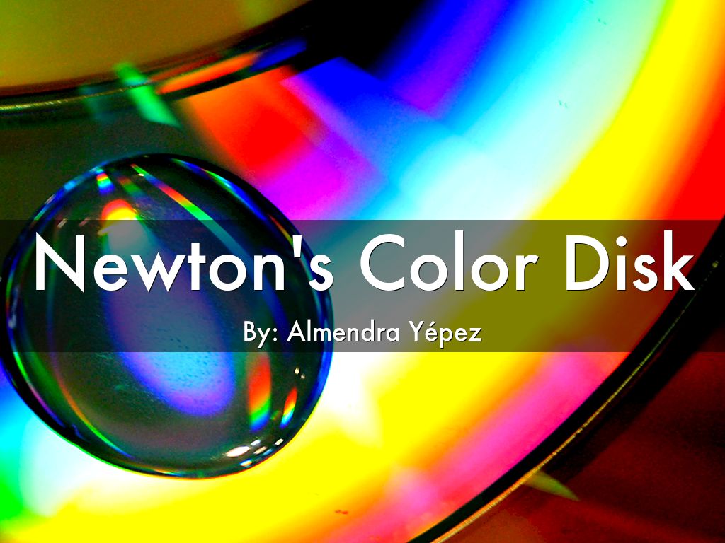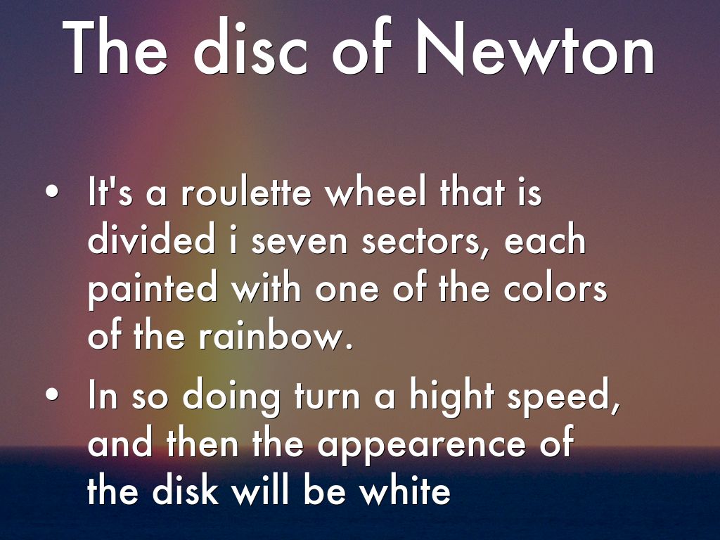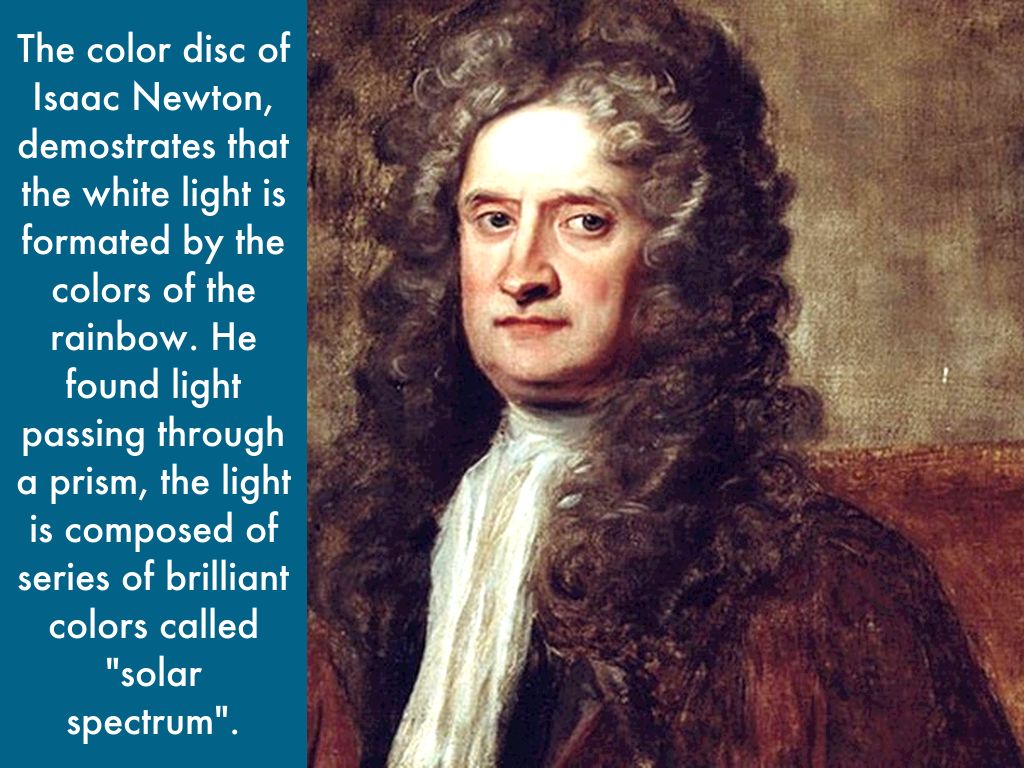 The color disc of Isaac Newton, demostrates that the white light is formated by the colors of the rainbow. He found light passing through a prism, the light is composed of series of brilliant colors called "solar spectrum".