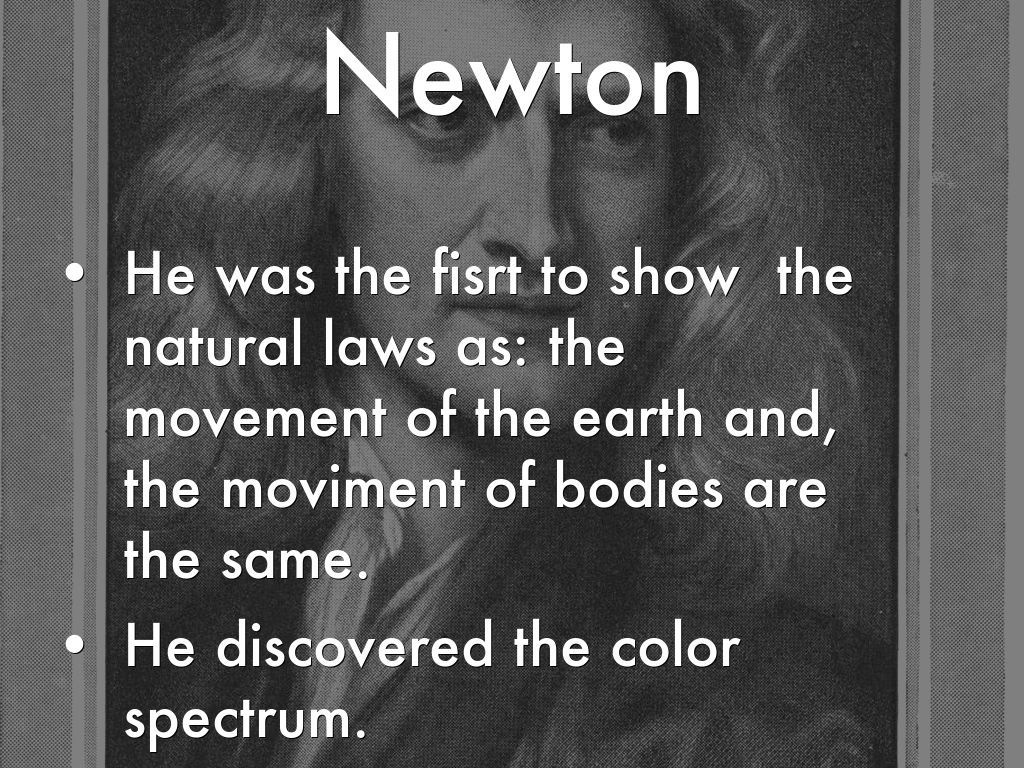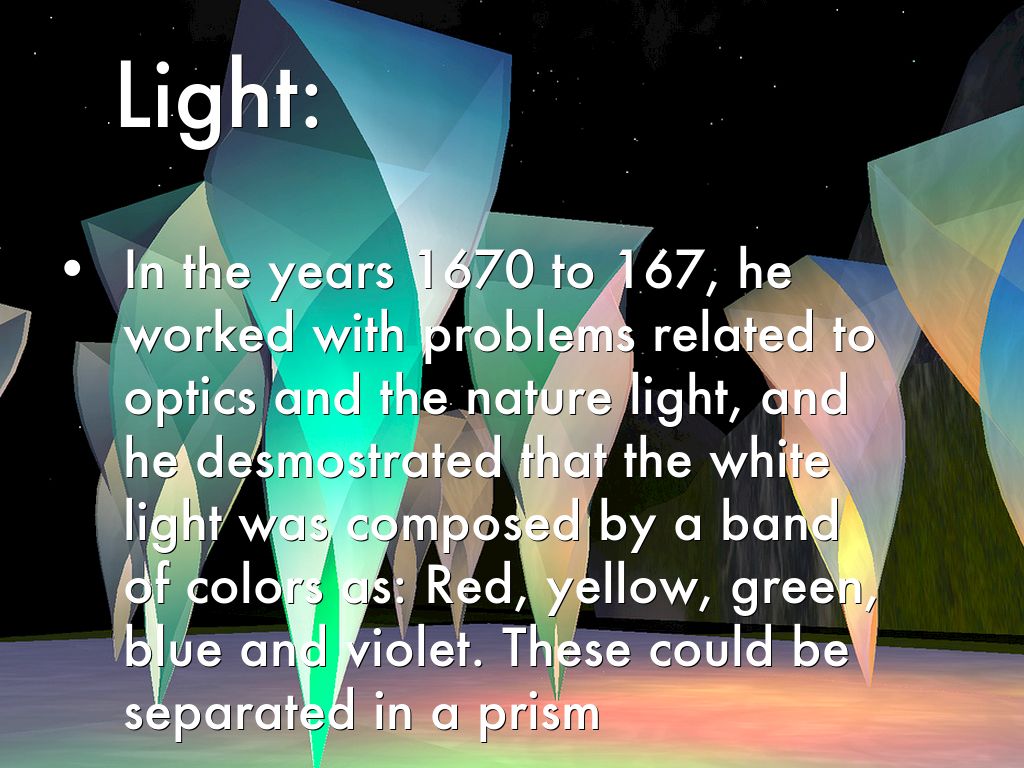 In the years 1670 to 167, he worked with problems related to optics and the nature light, and he desmostrated that the white light was composed by a band of colors as: Red, yellow, green, blue and violet. These could be separated in a prism