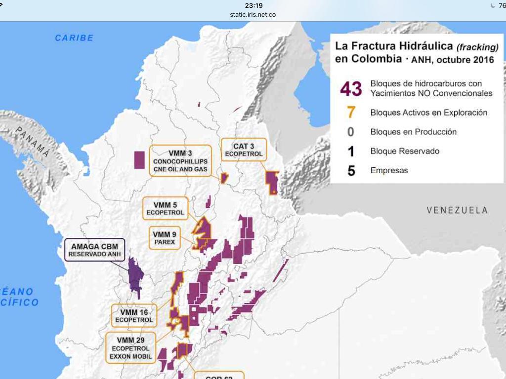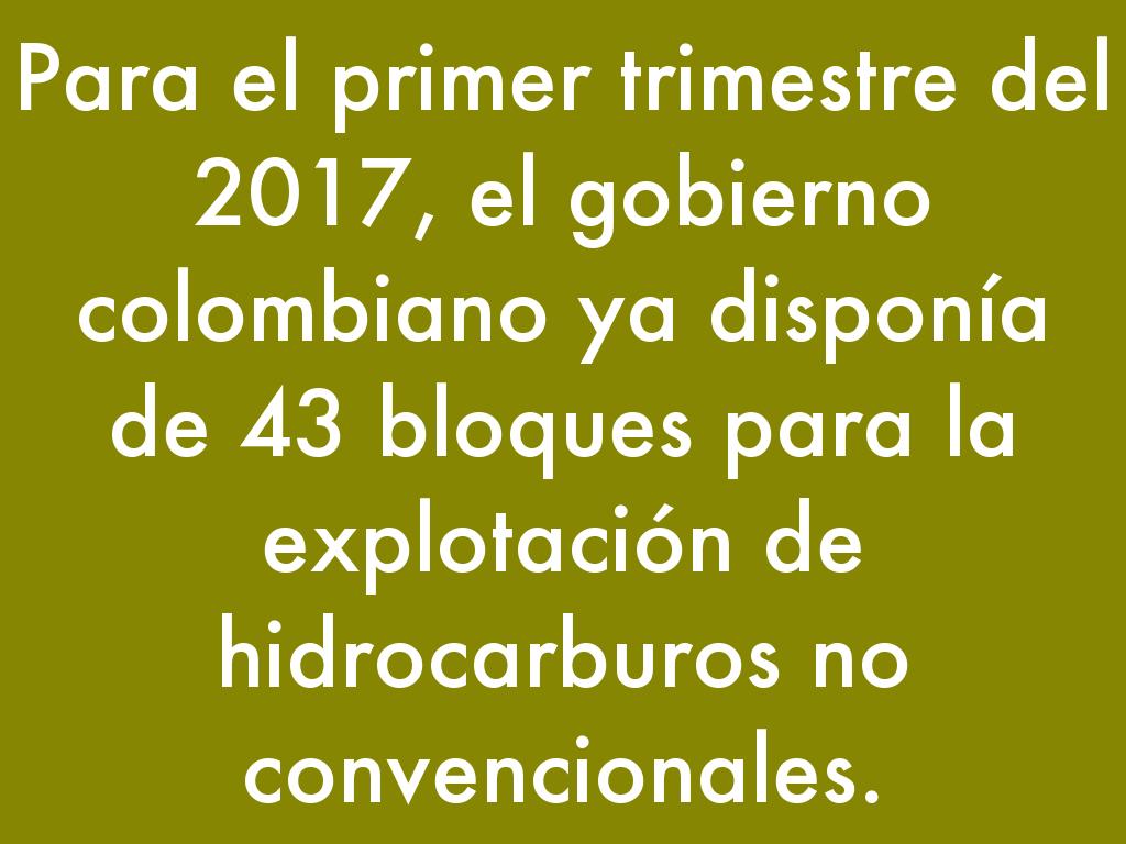 Para el primer trimestre del 2017, el gobierno colombiano ya disponía de 43 bloques para la explotación de hidrocarburos no convencionales.