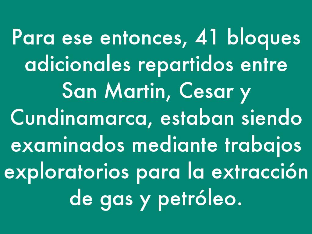 Para ese entonces, 41 bloques adicionales repartidos entre San Martin, Cesar y Cundinamarca, estaban siendo examinados mediante trabajos exploratorios para la extracción de gas y petróleo.