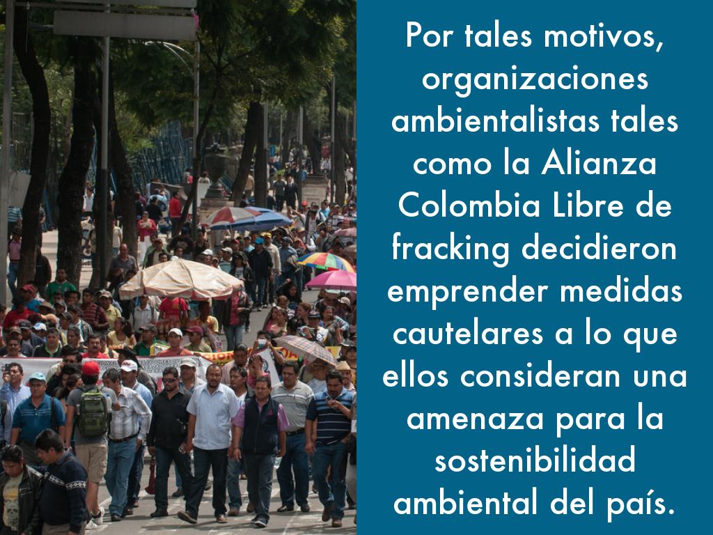 Por tales motivos, organizaciones ambientalistas tales como la Alianza Colombia Libre de fracking decidieron emprender medidas cautelares a lo que ellos consideran una amenaza para la sostenibilidad ambiental del país.