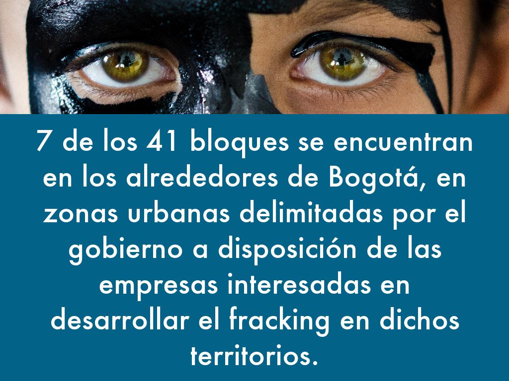 7 de los 41 bloques se encuentran en los alrededores de Bogotá, en zonas urbanas delimitadas por el gobierno a disposición de las empresas interesadas en desarrollar el fracking en dichos territorios.